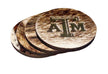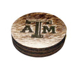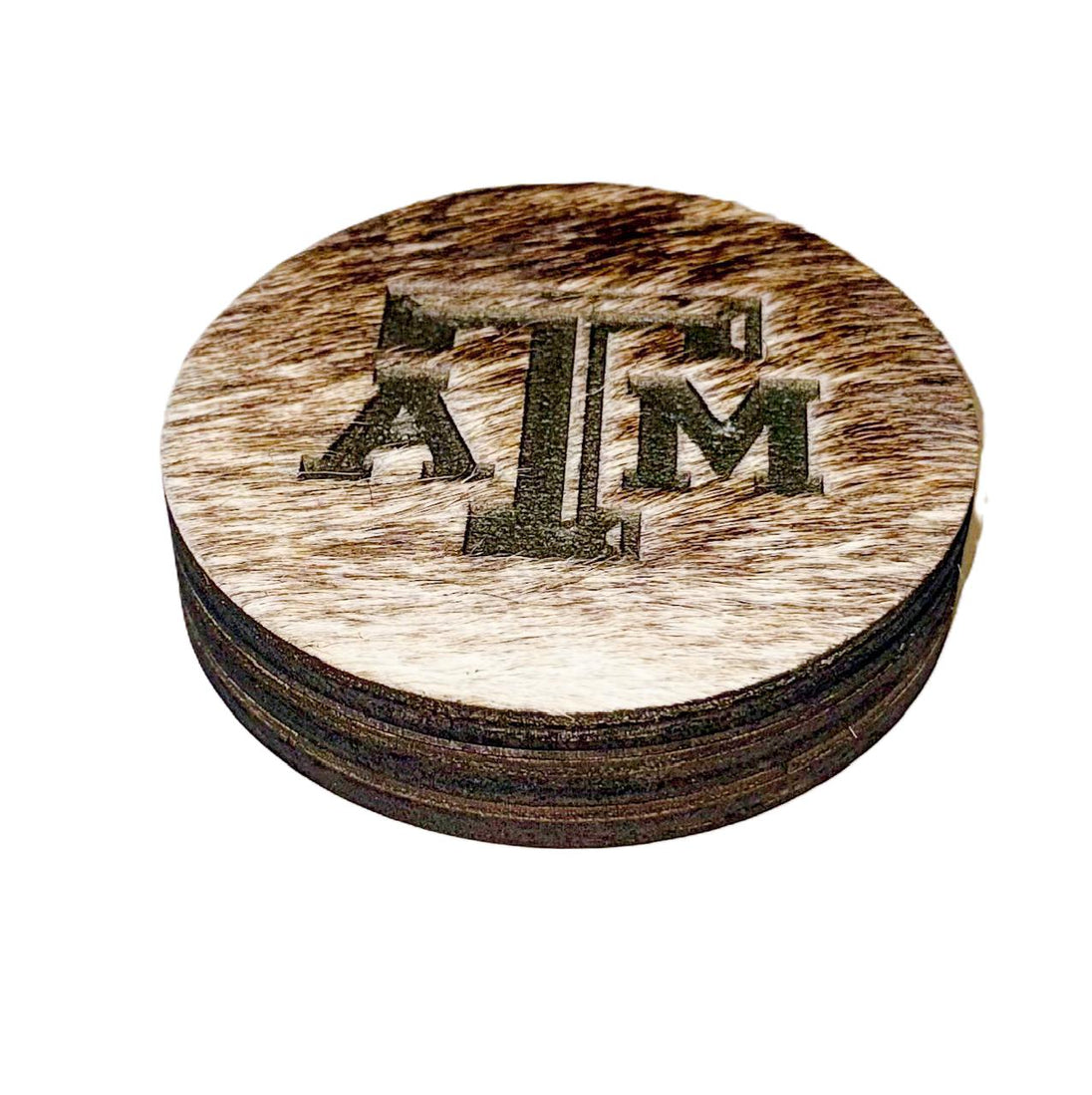 Genuine Cowhide coasters with solid wood backing. The A&M Logo is laser engraved into the cowhide for a detailed and permanent picture. Coasters measure 4" in diameter and about 5MM thick. Price is for a set of 4 and as always, shipping is free! Cowhide will vary from pictured, but will be from a brindle hide.. Makes a great inexpensive rodeo award or gift for the Aggie in your family.