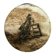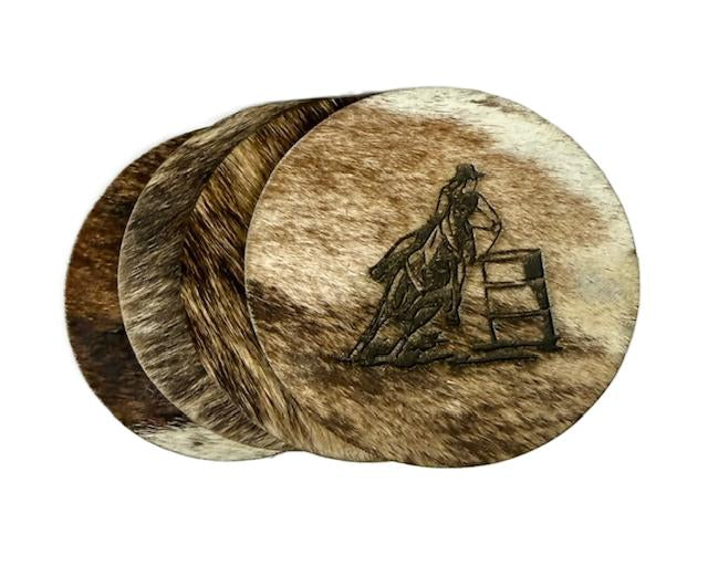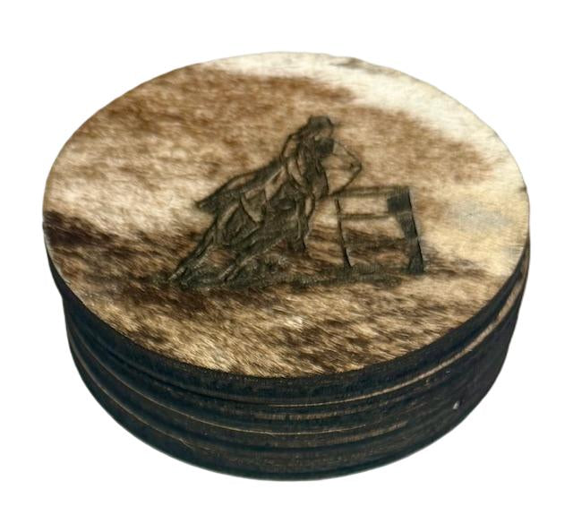 Genuine Cowhide coasters with solid wood backing. The barrel racer is laser engraved into the cowhide for a detailed and permanent picture. Coasters measure 4" in diameter and about 5MM thick. Price is for a set of 4 and as always, shipping is free! Cowhide will vary from picture, but will be from a brindle hide. Makes a great inexpensive gift or rodeo award.